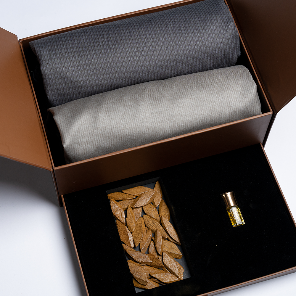 باقة الاهداء اقمشة شتوية فاخرة + مسك + بخور أوقية مروكي